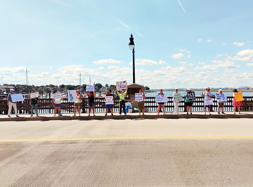 That incident, and at least two others in town, motivated a group of residents to come together every Saturday morning from 10 am to noon at the Belle Isle Bridge, a common protest location on Winthrop’s border with East Boston, for what they call a “standout in support of human rights.” What started as a one-off event has continued every weekend, rain or shine, for 15 weeks, with at least 20 to 30 people attending each time.
