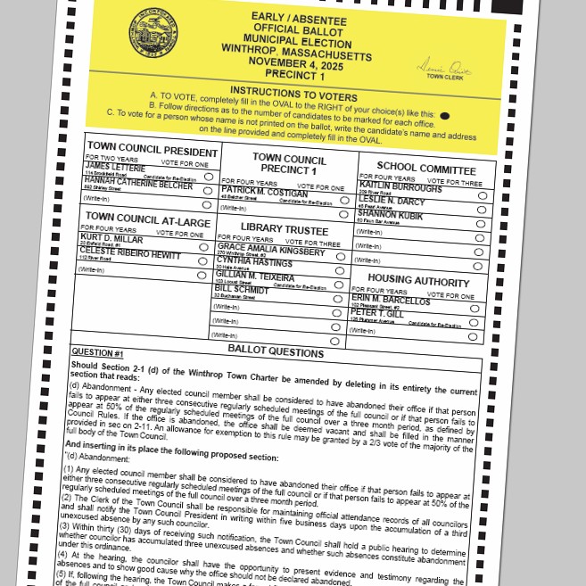 Town officials posted the ballot as they reported that voter registration numbers appear to be rising in Winthrop – leading some local anti-housing activists to suggest that they may start investigating the identities of new registrants.